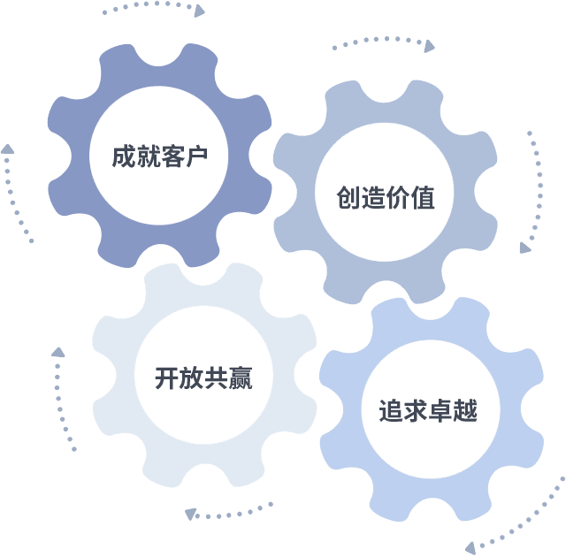 成就客户是一切决策的出发点,,,,创造价值是衡量所有工作的标准,,,,追求卓越是我们做事做人的态度,,开放共赢是我们的格局也是最终的结果。。。。价值观的齿轮环环相扣,,推动着组织里的每个人不断向前。。